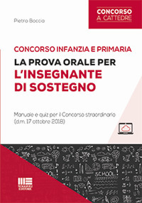 Il manuale costituisce un indispensabile strumento di preparazione alla prova orale per il sostegno del Concorso straordinario per docenti della scuola dell’infanzia e primaria (d.m. 17 ottobre 2018). La prova consiste in un colloquio per accertare la preparazione del candidato sul programma generale e specifico come descritto nell’Allegato A del decreto, e valutare la competenza del candidato nelle attività di sostegno agli allievi con disabilità. La prova orale per il sostegno valuterà anche l’abilità di comprensione scritta (lettura) e produzione orale (parlato) in una delle quattro lingue comunitarie tra francese, inglese, spagnolo e tede- sco almeno al livello B2 del Quadro comune europeo di riferimento per le lingue.