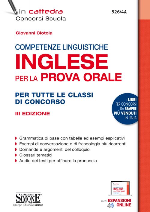 • sia la padronanza delle stesse da parte degli aspiranti docenti; • sia (e soprattutto) le competenze nel trasferire le proprie conoscenze ai discenti e nella progettazione didattica efficace, anche mediante le Tecnologie dell’Informazione e della Comunicazione (TIC), oltre che con riferimento agli studenti con bisogni educativi speciali. In sintesi, questa fase della procedura concorsuale, che ha una durata massima complessiva di 45 minuti, consiste in una lezione simulata e nell’esplicitazione delle scelte metodologico-didattiche in relazione ai contenuti disciplinari e al contesto scolastico indicati dalla commissione esaminatrice, nonché nell’illustrazione di esempi di utilizzo pratico delle TIC. Durante il colloquio, inoltre, dovrà essere accertata la conoscenza della lingua inglese e la capacità del candidato di comprensione e di conversazione (laddove questa non sia già richiesta per l’insegnamento cui si concorre) almeno al livello B2 del Quadro Comune Europeo di Riferimento per le Lingue (QCER). Non è richiesta, però, alcuna certificazione che attesti tale livello: il possesso delle competenze linguistiche verrà valutato esclusivamente in sede di colloquio. Il nostro volume è dedicato a questo particolare «momento» della prova orale e, lungi dall’essere il solito manuale teorico, utile solo per la ripetizione delle nozioni fondamentali, si presenta come un’autentica e completa «palestra d’esame», fornendo ai candidati tutti gli strumenti necessari per una performance d’eccellenza. Nel dettaglio, il testo è così strutturato: • INTRODUZIONE – L’importanza delle competenze linguistiche, in cui sottolineiamo la va-lenza fondamentale di tali competenze per un docente preparato e cosciente del proprio ruolo nella scuola del Terzo Millennio. Nel progetto della «nuova scuola», fondata su criteri meritocratici e che mira ad essere concorrenziale rispetto agli altri Paesi europei, infatti, la conoscenza di una o più lingue straniere, e più di tutte dell’inglese, ancor più che in passato target di riferimento della comunicazione internazionale, assume un ruolo determinante; • PARTE I – Grammatica di base della lingua inglese, dove, sia pure in maniera sintetica, pro-poniamo le tematiche morfosintattiche principali dell’idioma d’Oltremanica, consentendone un ripasso veloce e sistematico; • PARTE II – Elementi per affrontare il colloquio in lingua della prova orale, contenente validi suggerimenti nonché esempi di conversazione e di fraseologia tra i più ricorrenti in questo genere di verifiche; • PARTE III – Le domande e i temi del colloquio, all’interno della quale forniamo una selezione di argomenti, relativi al mondo della scuola osservato nell’ottica del docente, presentati sotto forma di «quesiti» ed efficacemente schematizzati per favorirne la comprensione e la memorizzazione, nell’intento di: — simulare il colloquio in lingua della prova orale, provando a prevederne i contenuti, — aiutare il candidato ad acquisire dimestichezza con parole, espressioni e concetti inerenti all’ambito educativo/formativo; • PARTE IV – Glossari tematici, composta da tre «repertori» linguistici, il cui scopo è quello di aiutare a «familiarizzare» con molti dei lemmi che potranno essere oggetto della prova d’esame: — il Glossario giuridico-scolastico, con innumerevoli espressioni e parole (in traduzione dall’inglese all’italiano) tratte dal lessico giuridico e riguardanti l’«universo scuola»; — il Glossario dei termini informatici di uso comune (in traduzione dall’inglese all’italiano e viceversa), per associare alle conoscenze linguistiche anche quelle digitali; — il Glossario glottodidattico e dei termini specialistici, in cui raccogliamo e illustriamo in lingua alcune delle voci fondamentali per accrescere il bagaglio culturale e professionale del futuro insegnante. Completano il lavoro: • un Test di valutazione delle proprie competenze linguistiche ? costituito da una serie di quesiti a risposta multipla di contenuto prettamente grammaticale (tutti con chiave di risoluzione) e da alcune brevi letture su tematiche metodologico-didattiche, seguite da quesiti di completamento e di comprensione (corredati di soluzioni) ?disponibile in Espansione online; • Audio Practice, ovvero l’audio digitale delle intere Parti II e III, per consentire al candidato di perfezionare la pronuncia e l’ascolto dell’inglese. Entrambe le risorse sono accessibili tramite il QR Code posto all’interno del volume oppure collegandosi alla pagina www.simone.it/d/526_4A. Per un miglior ascolto dell’audio, consigliamo di effettuare il download dei file sul proprio PC e di utilizzare le cuffie. |